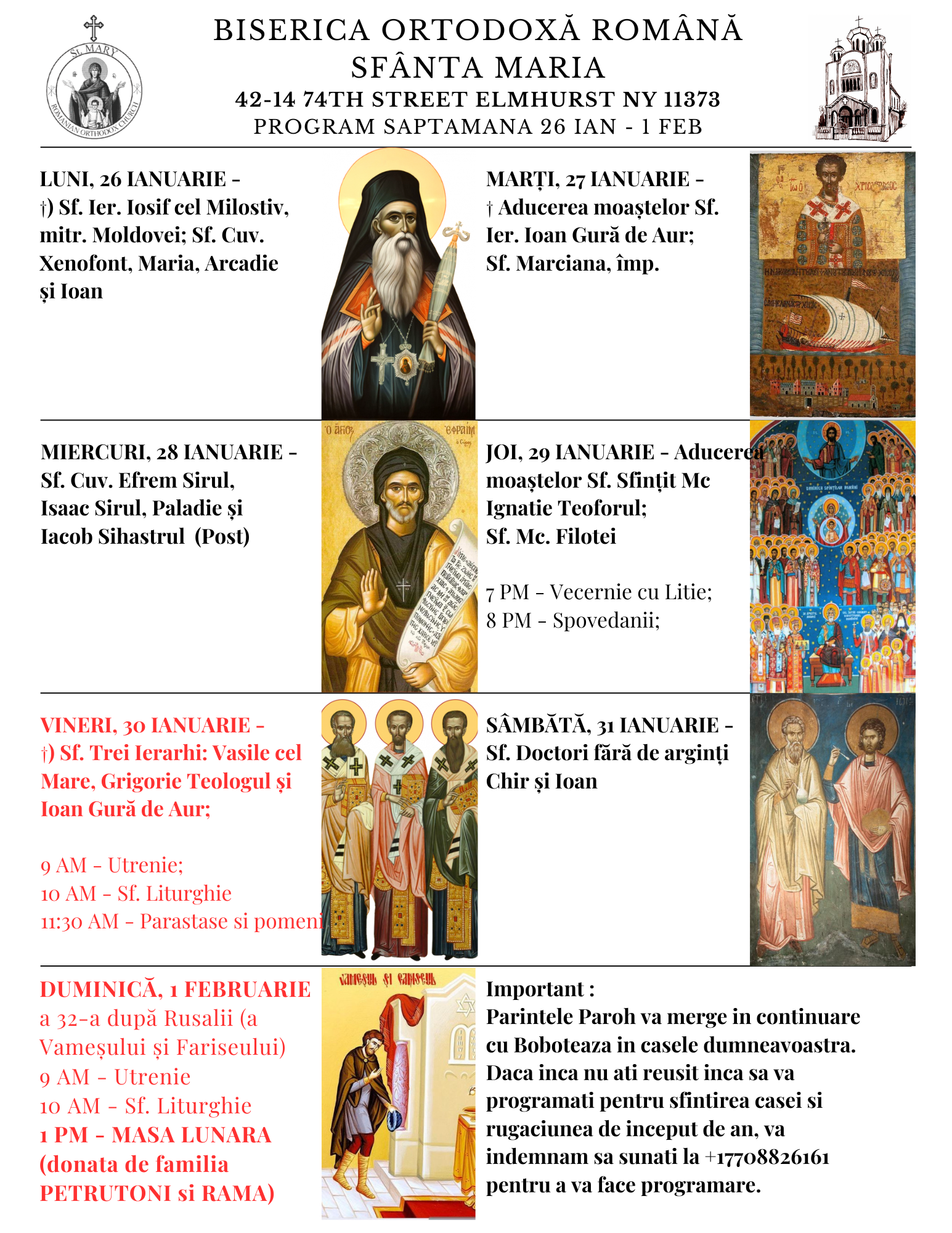 Oricine dorește să primească Sfânta Cruce și să își binecuvinteze casa se poate programa la telefon la pr. Chesarie sau pe listele de la biserică, menționând 2–3 date disponibile. În funcție de zonă, fiecare va fi sunat și programat.